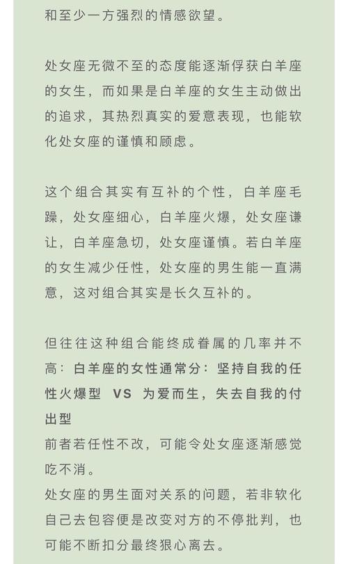 若不协调好,也许还会演变成互看不顺眼的困境。但幸运的是,白羊座的女人有她的单纯和简单,处女座的男人有自己的体贴和细心,两个人坚持到最后可能不是一对幸福的夫妇。至少白羊座女性风风火火的个性又能给呆板的处女男带来更多的生活乐趣。这就是互补的能量!谁说性格完全不同就不能在一起?至少只要双方共同努力,一切都是可能的!