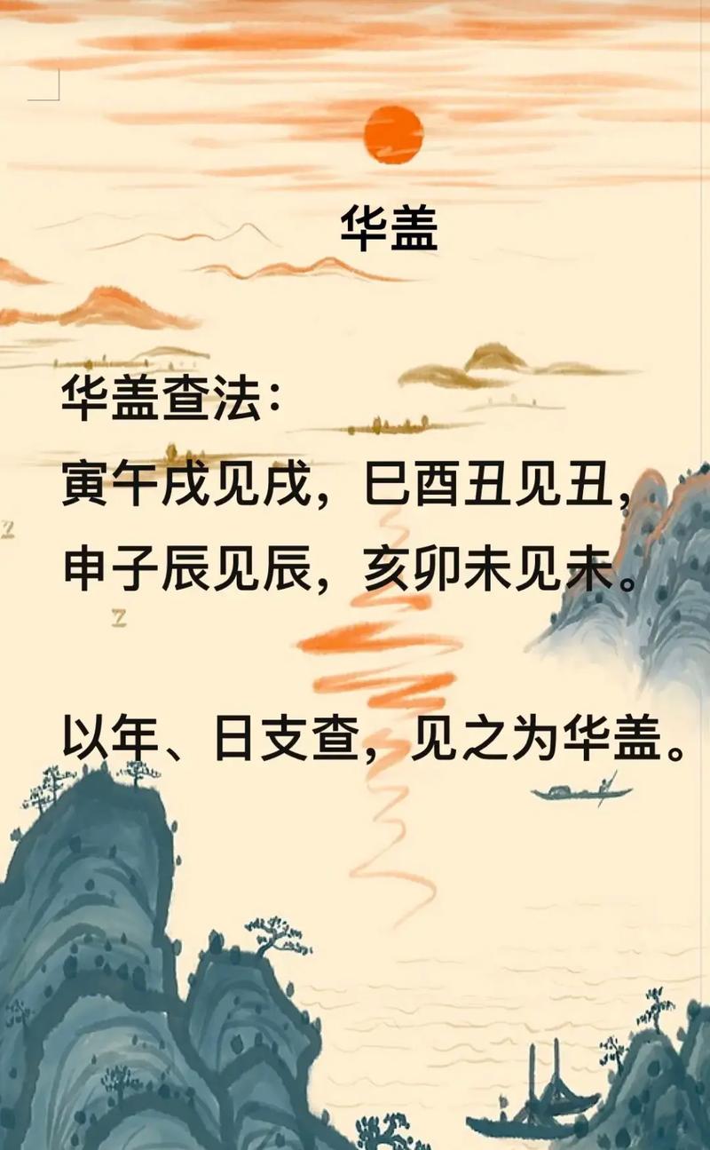 华盖,这是八字推命的命格之一,以十二支三合为特征,又遇到了三合的最后一个地支。比如“寅午徐”三合,再遇到最后一个“徐'”;就是华盖。华谊之命不难求。秘密歌说:三柱中寅、中午、徐,第四柱中再遇徐;三柱中的三、酉、丑,第四柱中再遇丑;三柱中的申、子、陈,第四柱中再遇辰;三柱中的海、毛、未,第四柱中再遇未。